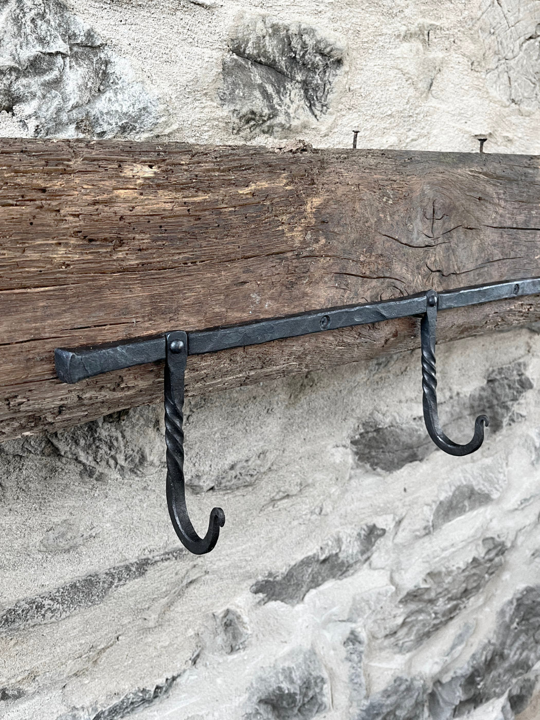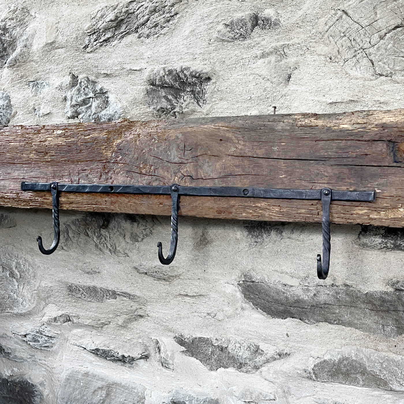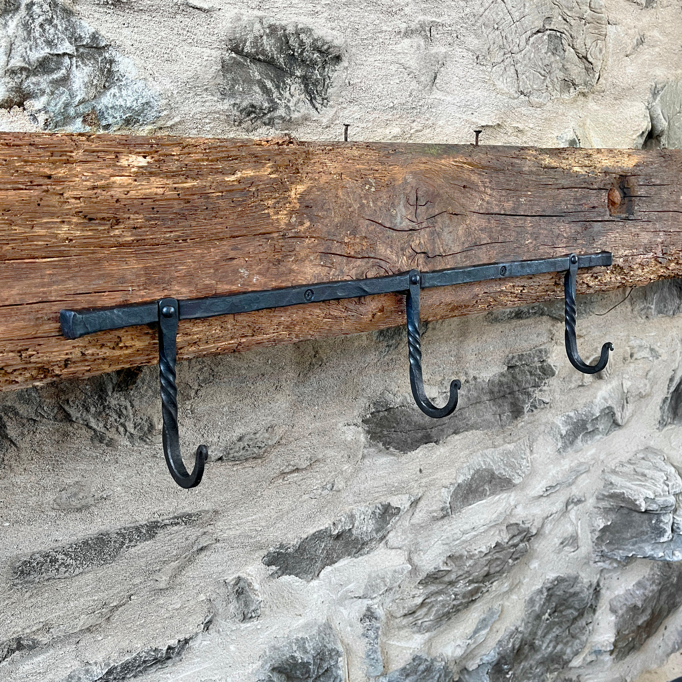 Three hand-forged hooks riveted to a wall-mounted forged bar. Great catch-all hooks for entryways, mudrooms, bedrooms… anywhere really.