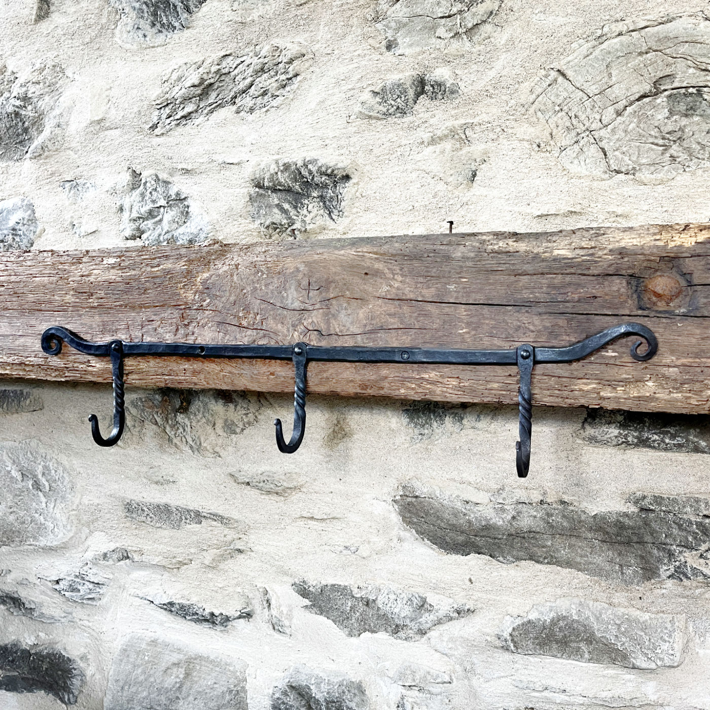 Three hand-forged hooks riveted to a wall-mounted forged bar. Great catch-all hooks for entryways, mudrooms, bedrooms… anywhere really.